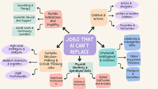 The above chart is one take on jobs that may be less susceptible to AI replacement. I don’t agree with all. In general, anything where a physical presence is needed is more likely to survive. We’re talking AI here—not robots, though those may proliferate as well.